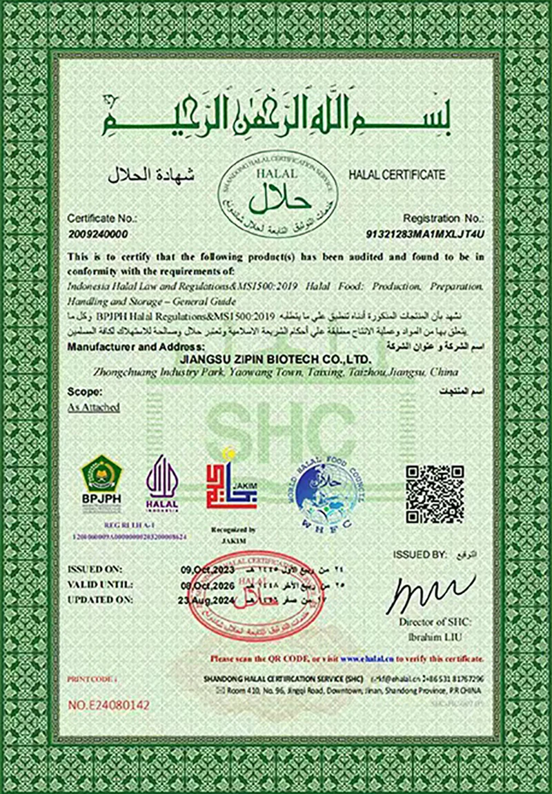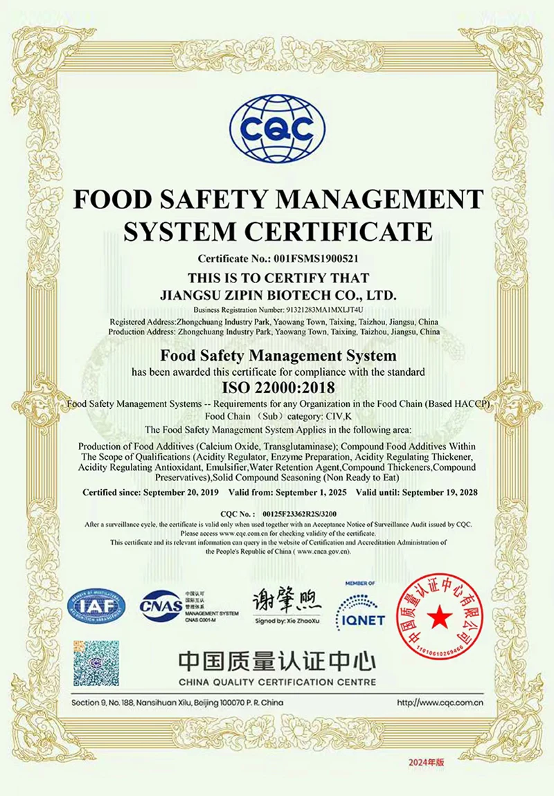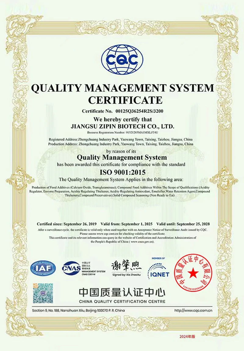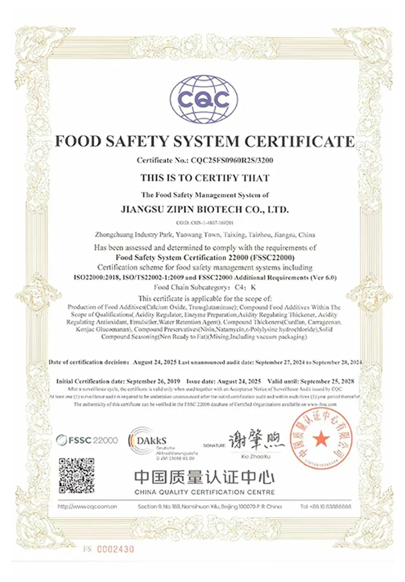 Jiangsu Zipin Biotech Co., Ltd. 2016-ban alakult, 20 000 ㎡ területen. Modern magánvállalkozásként jelenleg elsősorban élelmiszer-adalékanyagok kutatás-fejlesztésével, gyártásával és értékesítésével foglalkozunk. Fő termékeink aTranszglutamináz, Curdlan, ε-polilizin, Nisin, Natamycin és egyéb élelmiszer-adalékanyagok.